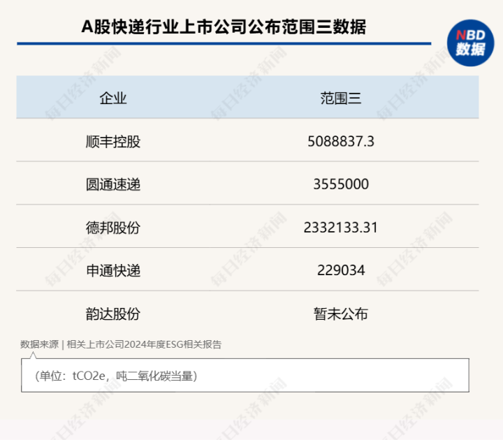《每日经济新闻》记者观察到,主要快递公司顺丰控股、申通快递、德邦股份以及圆通速递都公布了温室气体排放范围三。