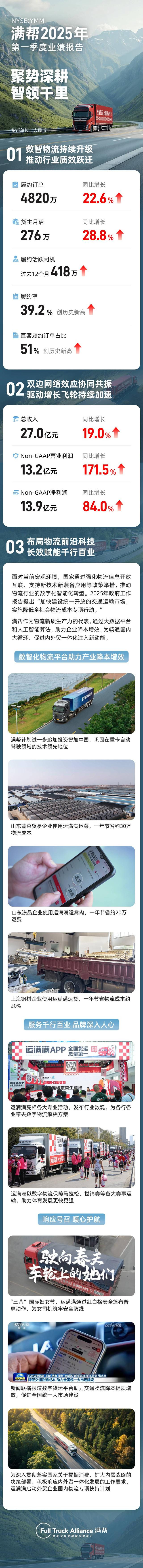 满帮集团董事长张晖表示,2025年第一季度,“在充满机遇和挑战的经济环境下,满帮坚持以数字化、智能化驱动公路货运行业降本增效。坚持对品牌和线上拉新长期投入,货主规模高速增长,用户结构持续优化;通过司机行为分、优先卡、好货秒抢、司机会员等机制,司机生态和匹配效率不断改善。”